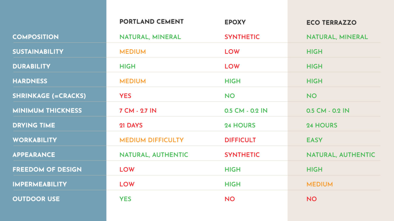 Consumption: Over 1 square meter you need 2,42 kg of Terrazzo mixture for each millimetre of thickness. For example, to achieve 1 cm of thickness over 1 sqm you will use 10 kg of COMPONENT A, 4,167 kg of COMPONENT B and 10 kg of cheaper material, like marble aggregates, for a total of 24,167 kg.